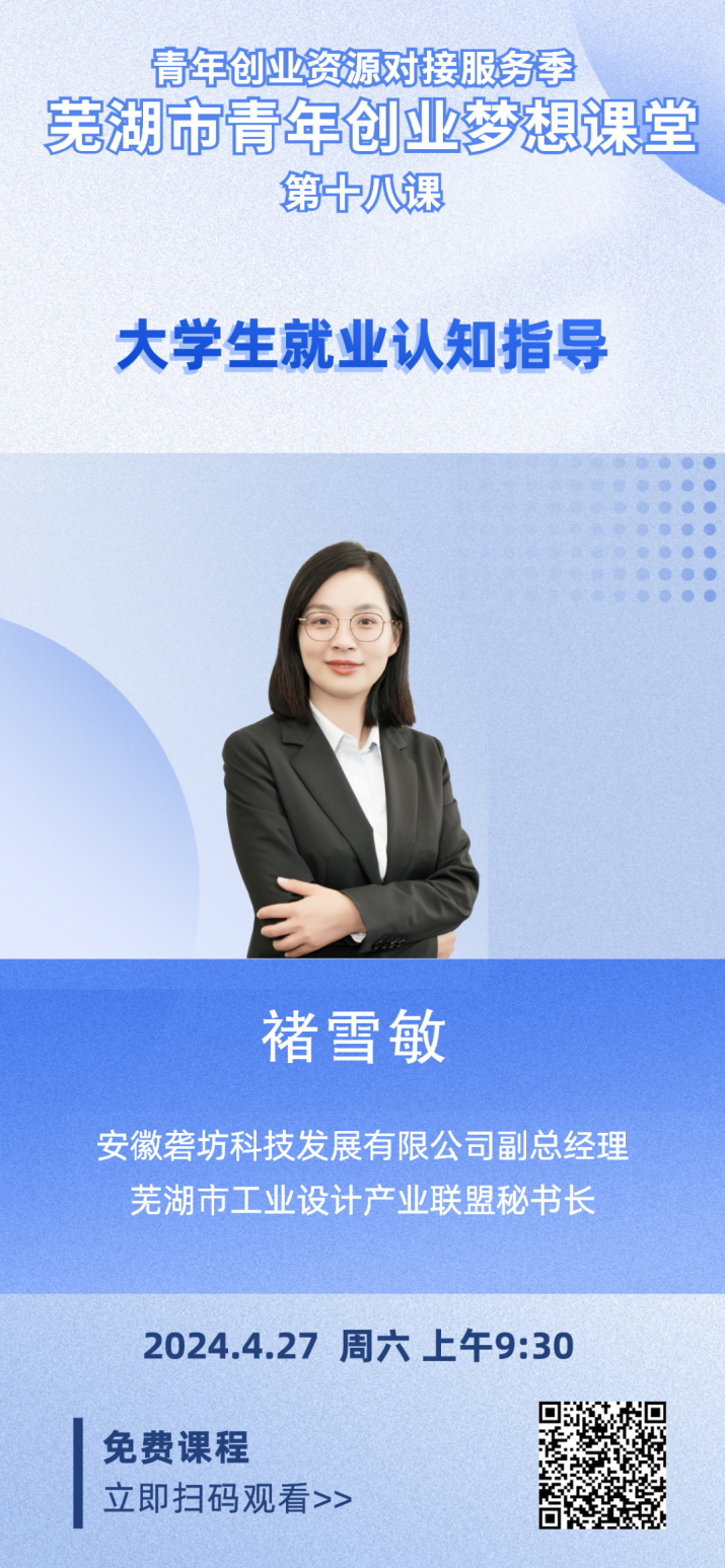 4月27日上午,“源來好創(chuàng)業(yè)”青年創(chuàng)業(yè)資源對接服務季——蕪湖市青年創(chuàng)業(yè)夢想課堂第十八課正式播出。本次是由安徽礱坊科技發(fā)展有限公司副總經(jīng)理,蕪湖市工業(yè)設計產(chǎn)業(yè)聯(lián)盟秘書長褚雪敏帶來的《大學生就業(yè)認知指導》課程。